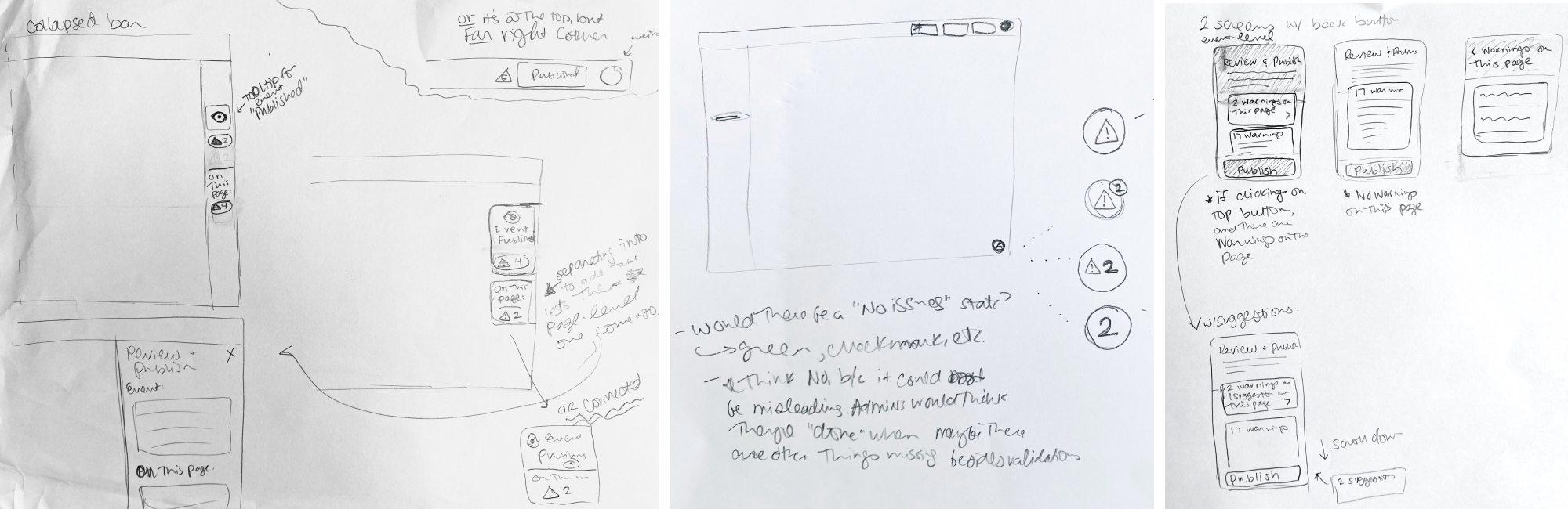 Process sketches for the Publishing and Validations feature, which I designed to make it easier for admins of various permission roles to ensure that all required components of the event templates have been fulfilled. I explored numerous solutions, and eventually landed on a straightforward system of warnings and notifications. The eventual solution was a sticky tab component fixed to the right edge of the screen, which can be expanded to reveal details and additional options.